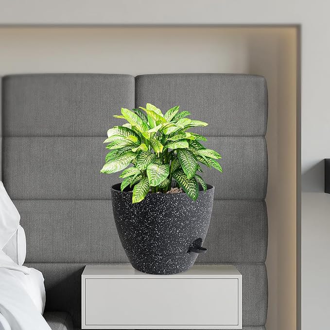 12 inch Large Self Watering Pots, Planter, Plant Pots with Mesh Drainage Holes for Indoor Outdoor House Plants and Garden, Plastic Flower Pots with Deep Reservoir, Speckled Black
