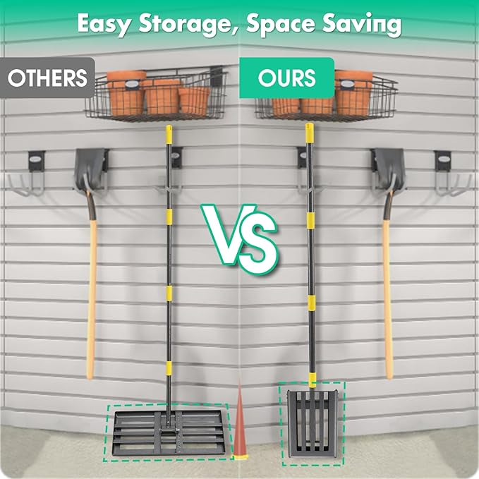 - Folding Lawn Leveler: This leveling rake with folded dimensions of 13.5"(W) x 10"(L)- Makes for easy transportation and storage when not in use,saving 50% space in your garage. The whole leveler can be disassembled so can adapt more types of car space