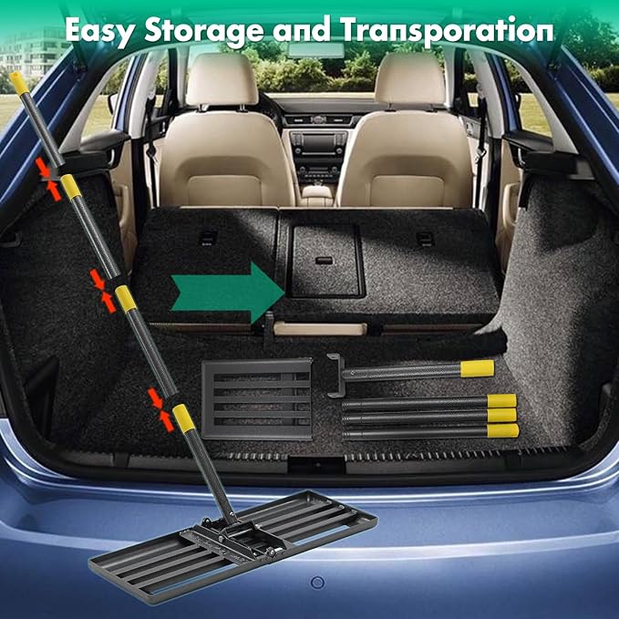 - Folding Lawn Leveler: This leveling rake with folded dimensions of 13.5"(W) x 10"(L)- Makes for easy transportation and storage when not in use,saving 50% space in your garage. The whole leveler can be disassembled so can adapt more types of car space