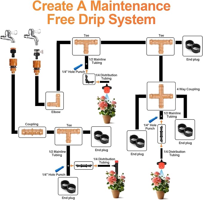 - 【High Impact Drip System Parts】:Constructed of highly durable UV resistant materials, this 1/2 inch drip irrigation parts guarantee extended operation in harsh conditions. One-piece construction for added strength and durability for long-term performance.