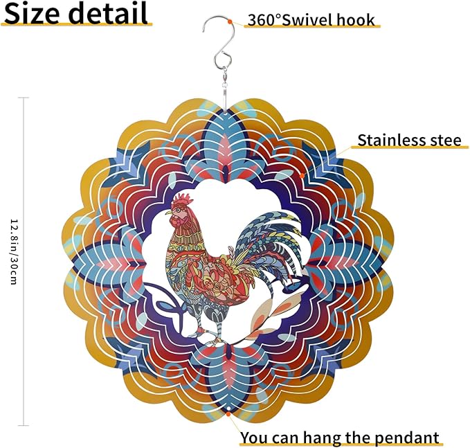 - 360 Degree Rotation 3D Wind Spinner Decor: This decorative hanging wind spinner is inspired by the enchanting rooster style. It showcases PUV printing technology and a frosted lacquer surface that shimmers as it spins. The distinctive design seamlessly blends meaningful animal motifs with 3D streaming effects, resulting in a visually captivating appearance. Ideal for enhancing the look of your garden and patio. Please ensure to use in windy conditions