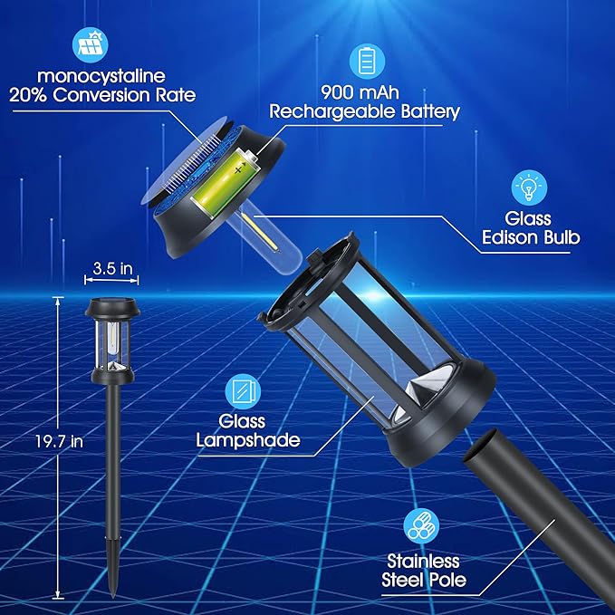 - SOLAR POWERED & LONG LASTING: Solar garden lights use advanced monocrystalline solar panel , which has the high conversion rate to assure solar landscape lights faster charging. higher capacity rechargeable battery means our solar stake lights can effectively absorb more sunlight and converts it into electricity. Charging for 6-8 hours can continuously glow for 8-10 hours, The solar lights outdoor automatically turn on at night and turn off at dawn. which meets your needs