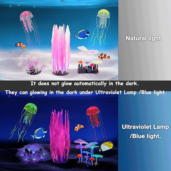 - 【Glowing In The Fish Tank】The glowing effect of these glow aquarium decorations will only happen to acted lighting, not "Glowing in the dark!". The ornament does not glow automatically in the dark. They can glowing in the dark under Ultraviolet Lamp /Blue light. Make sure you rinse it off before place it in your tank. Create a beautiful and mysterious under water world. Perfectly matched your aquarium and other fish tank.