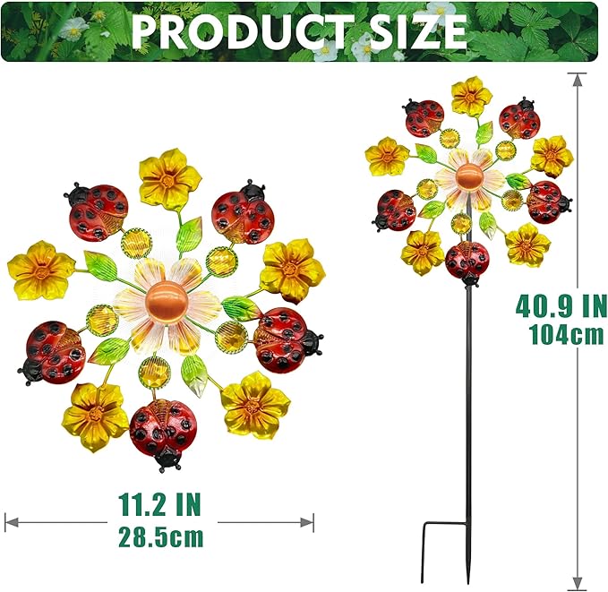- 【Materials and Sizes】The wind spinner is made of 5 beetles and 5 delicate flowers, and coated with rust proof coating to improve durability. Size: 40.9" H * 6.7" W * 11.2" L.