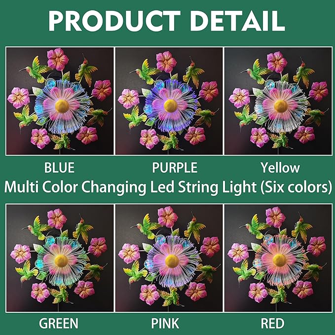 • 【Easy installation】The wind spinners are very easy to install, just tighten all the components and insert them into the ground or lawn to decorate your yard, garden, etc. The colored LED lights will automatically turn on and can last for 8 hours or longer at night.