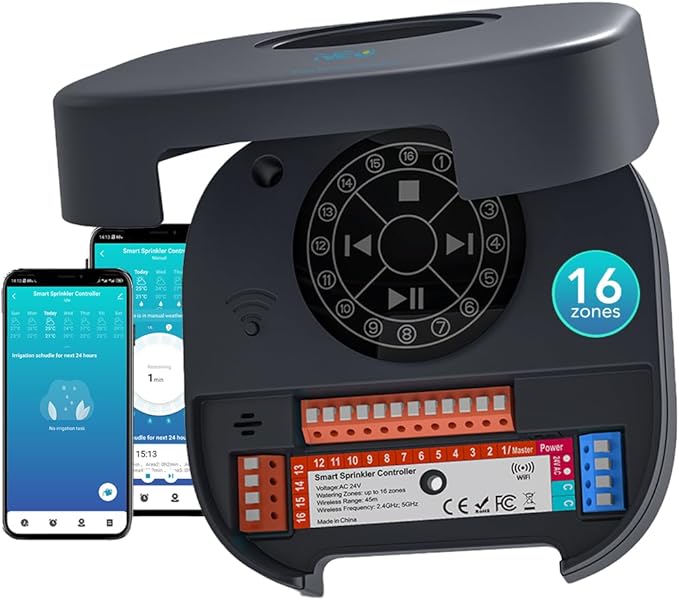 WiFi Irrigation Controller, 16-Zone Smart Sprinkler Controller, Auto Schedules, Weather-Based Watering, Indoor Use, Compatible with Alexa for Garden and Yard
