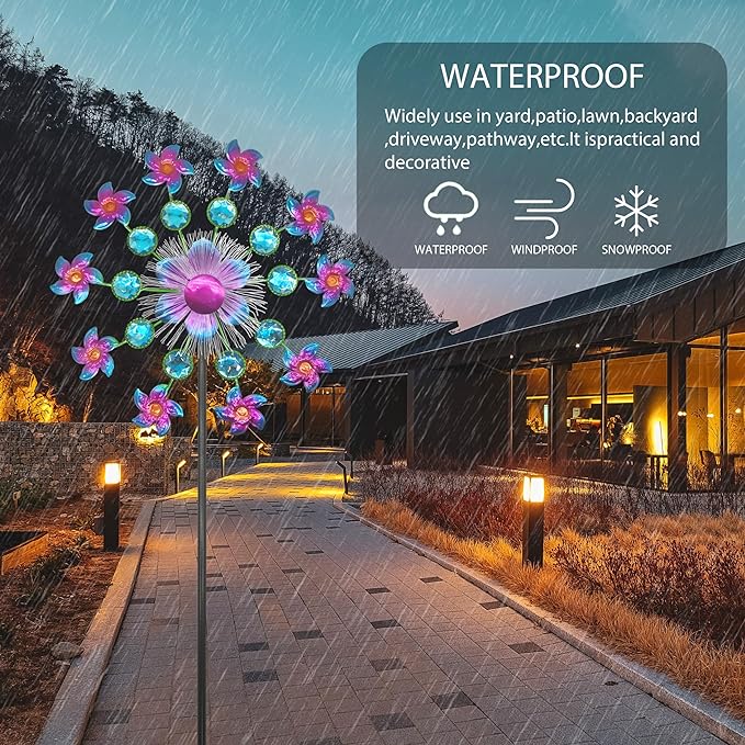 • 【Easy installation】The wind spinners are very easy to install, just tighten all the components and insert them into the ground or lawn to decorate your yard, garden, etc. The colored LED lights will automatically turn on and can last for 8 hours or longer at night.