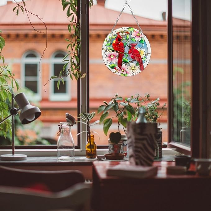 - PERFECT ANYWHERE - This cardinal bird stained glass is sure to be a beautiful sight to hang in your garden, patio, balcony, window, hallway, entertainment venue and more. Cardinals suncatchers can also be used to decorate bedrooms, living rooms, gardens, terraces, and anywhere that needs to add a beautiful melody to the environment.
