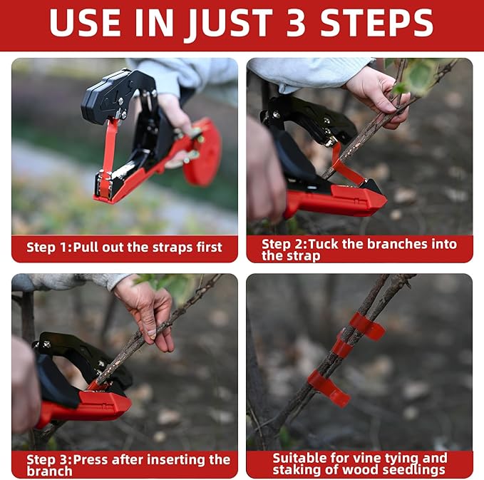 - 3 Simple Steps: Press the handle to release the tape, enclose the branch within the tape, then with a gentle press and release of the handle, you're done