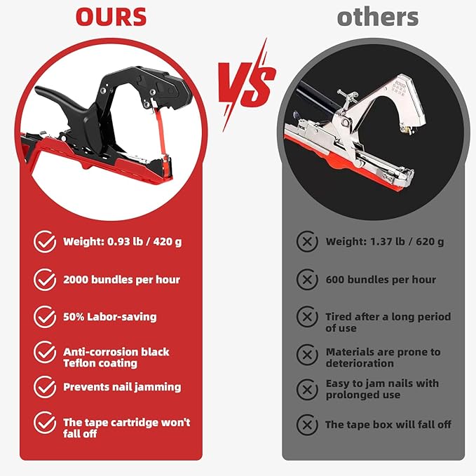 - Precision & User-Friendly: Our garden binding tapener features a high-precision, visible staple slot and our no-disassembly needle design, enhancing operational convenience. Additionally, the secure tape box won't fall off.