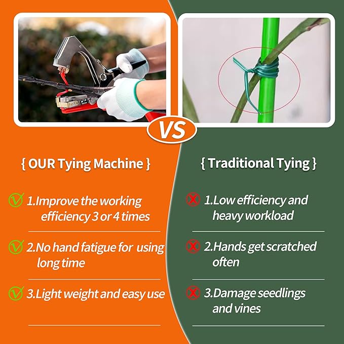 - 『Efficient and Economical Gardening Tool』 This plant tying machine can accomplish 3-4 times the work of hand tying. It also greatly improves your efficiency, savings labor costs and saves time as well, especially working with large numbers of plants.