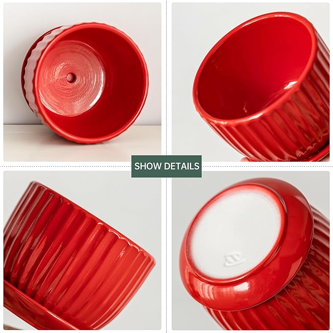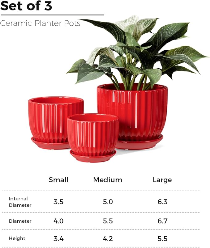 - ❀【VERSATILE 3-POT SET 】- Set of 3 red ceramic pots in sizes of 4", 5", and 6" for indoor plants, with drainage holes and trays for healthy root growth.