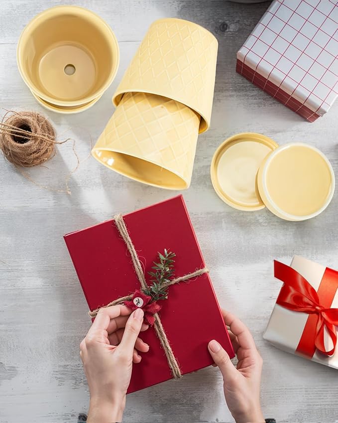 - 🌵Unmatched Quality - Crafted from durable ceramic made of kaolin, our flower pots boast superior quality and resilience. Each planter includes a drainage hole at the bottom to minimize water run-off, promoting healthier plant growth.