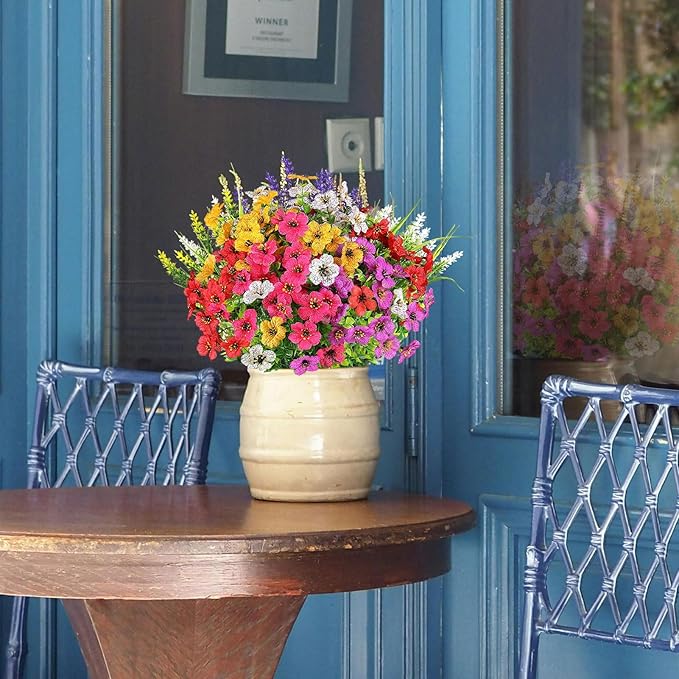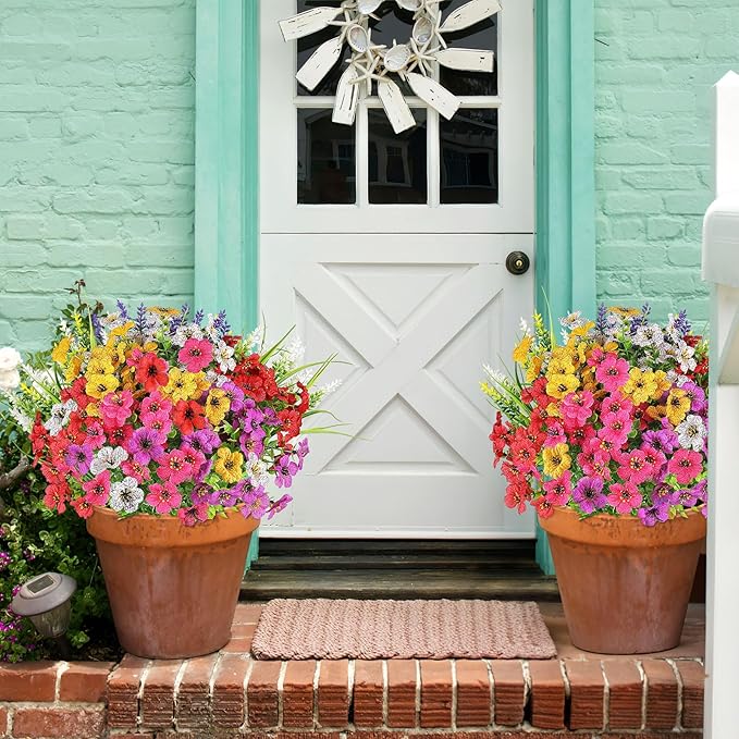 - Perfect for Outdoor/Indoor - Plastic flowers are ideal for outdoor porches,walkway,terraces,window box,front yard,pots,hanging planters,gardens,landscape,windowsills,allow you have beautiful color all year around.Also suit for birthdays,weddings,Memorial place or grave,they can live anywhere,and have withstood heavy rain storms and winds