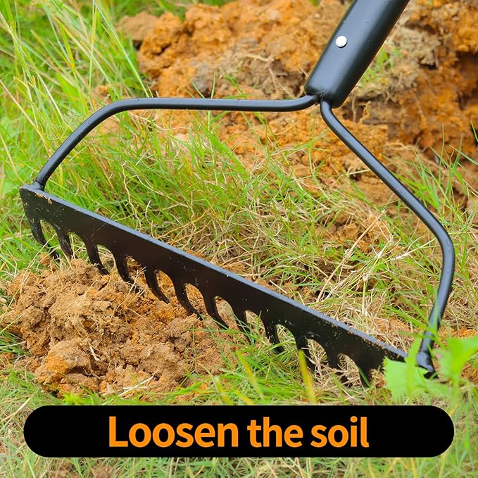- 14 Tines Bow Rake: The bow rake with 14 sharp steel teeth can easily cut through the soil, and the wide bow rake head design can greatly improve gardening efficiency.