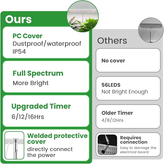 - Upgraded Plant Grow Light: Our plant lamp is equipped with PC cover, and a protective sleeve is welded to the lamp board interface. Not only is it waterproof, it also provides safe lighting protection.5.2 in metal base and anti slip pads ensure stability.