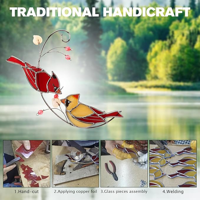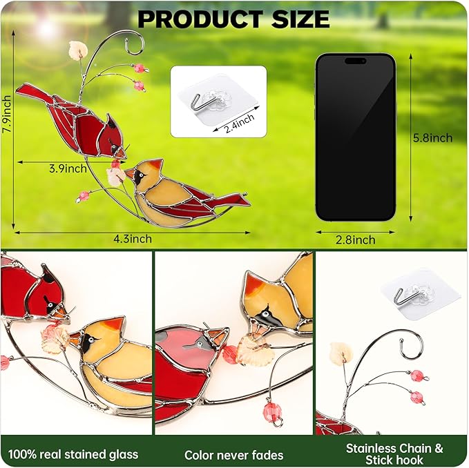 - 【Beautiful Decoration】Stained glass cardinal suncatcher colors are vibrant, the birds are cute and includes a clear back adhesive hook for hanging the piece, or you could just use any string, chain, etc. to hang the cardinal sun catcher anywhere you want to deco.