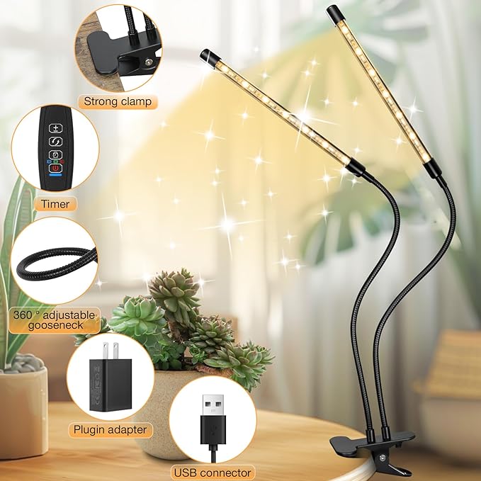 LED Grow Lights (2 Packs), 2 Heads Red Blue White Full Spectrum Plant Light with Clamp for Indoor Plants & Seed Starting, 10-Level Dimmable, Auto On Off, Timing 4 6 12Hrs