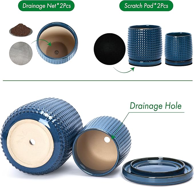 - Drainage Hole & Matching Saucer: Each pot comes with pre-drilled drainage hole and perfectly matching ceramic design tray for small amount of excessive water drain.