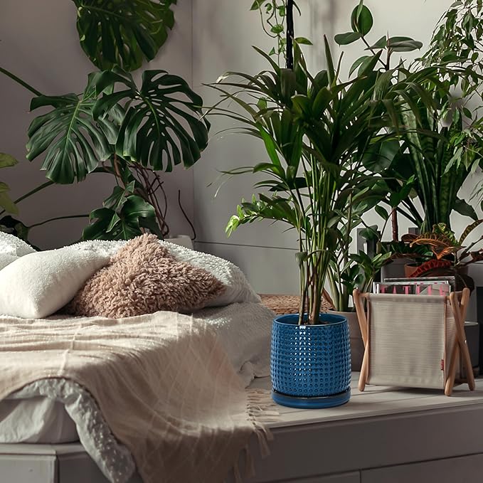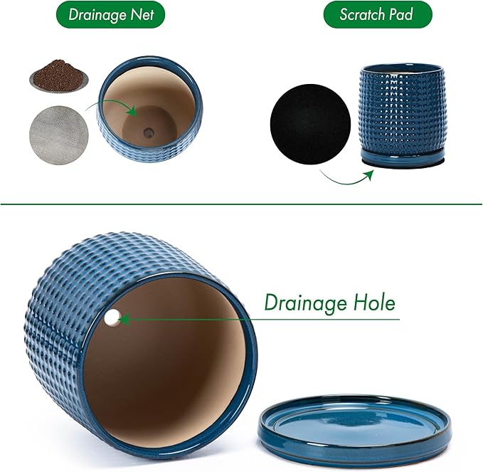 D'vine Dev 6 Inch Ceramic Beaded Stoneware Planter Pot - Flower Pot with Drainage Holes and Saucers for Indoor Succulent Plants or Flowers, Blue, 27-C-X-3