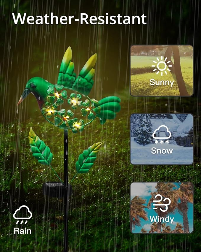 - 【Outdoor Solar Light Water Resistant】: The metal hummingbird garden solar light decoration is made of high-quality metal materials, which are waterproof and windproof and can be used in any weather conditions.