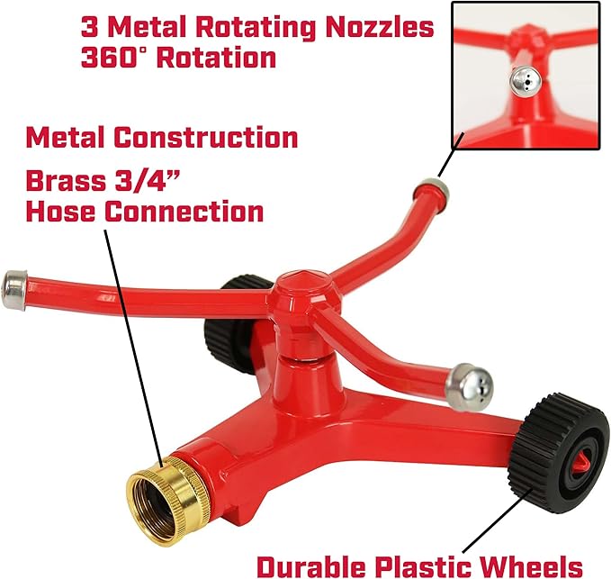 - CONSTRUCTION: crafted from premium metal, making it corrosion-resistant and sturdy; wheel base makes it easy to tow from one watering zone to the next; threaded connection; variable working pressure – working pressure depends on your home water pressure