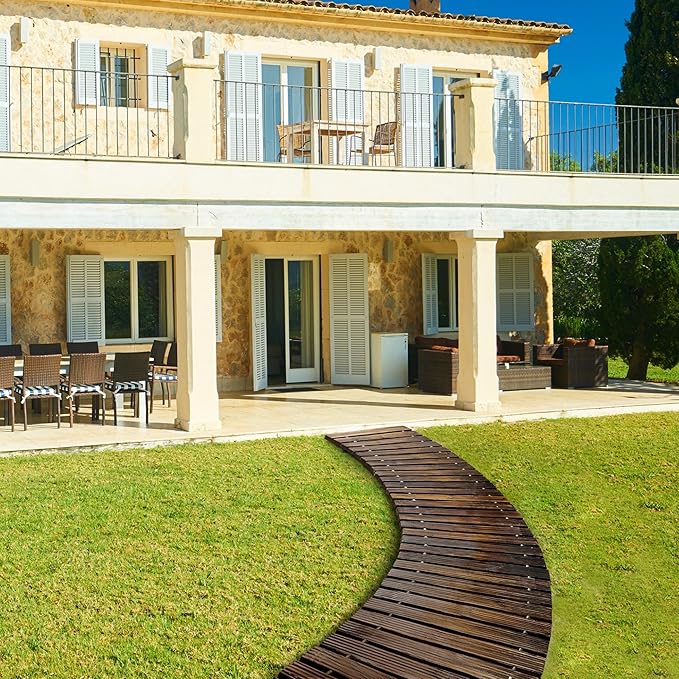 - Widely Uses:Create a practical and non-slip footpath anywhere with this rustic curved wooden pathway!It not only keep your feet and shoes clean and dry from dirt,mud, grass,stones and sands,but also add a decorative touch to your outdoor landscape!It is ideal for almost any outdoor space,like gardens,backyard,patios,porch,balcony,mountain cabins,summer fun beach houses,ocean-front properties,vegetable farm,and perfect for most outdoor activities,such as camping,wedding events,BBQ,beach party