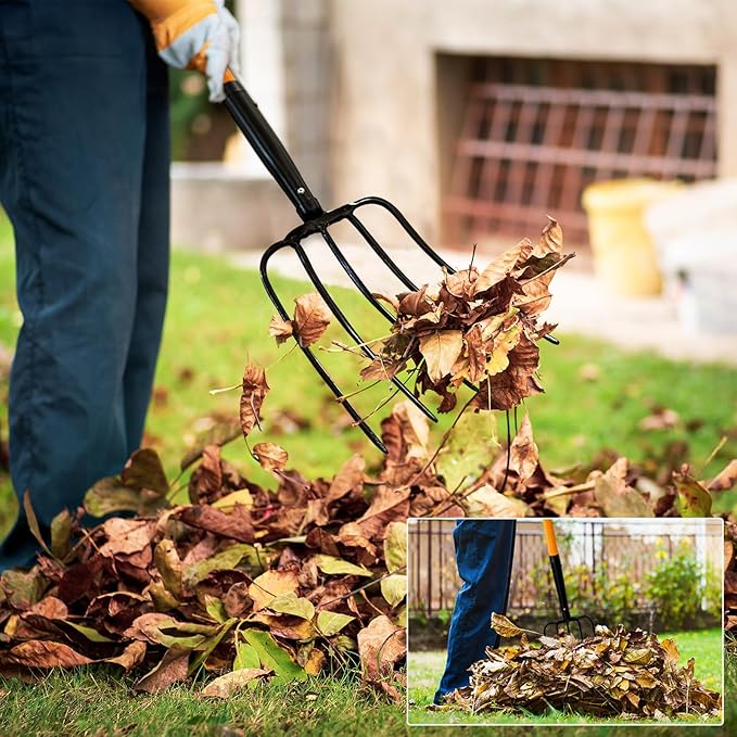 - Wide Use: You can use the 5 tine pitchfork to move hay, manure, grain, mulch, and fall leaves. Our pitchfork for mulching has 5 tines and can carry more at a time to help you be more efficient! I'm sure the pitch fork will help you get your gardening done quickly and efficiently.