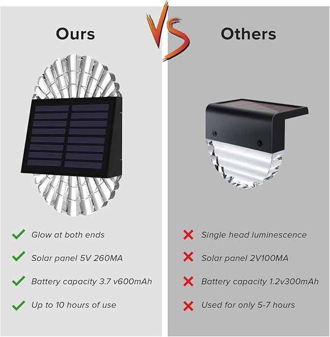 - 【Easy Installation】Our solar deck lights outdoor have two installation methods, you can either place it vertically or horizontally. And you can use the screws with anchors or adhesive tapes to install them, which are all included in the package. If you have any questions please feel free to contact us.