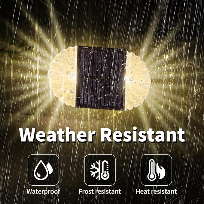 - 【Two Way Lighting】The solar sea-shell patio lights are unique in design, can emit warm white lights on both sides, 16 lighting sources in total. Even during the day the fence post lights look like crystal clear gems. And the sea-shell shape can also be a backyard decoration in daytime.