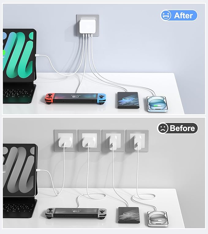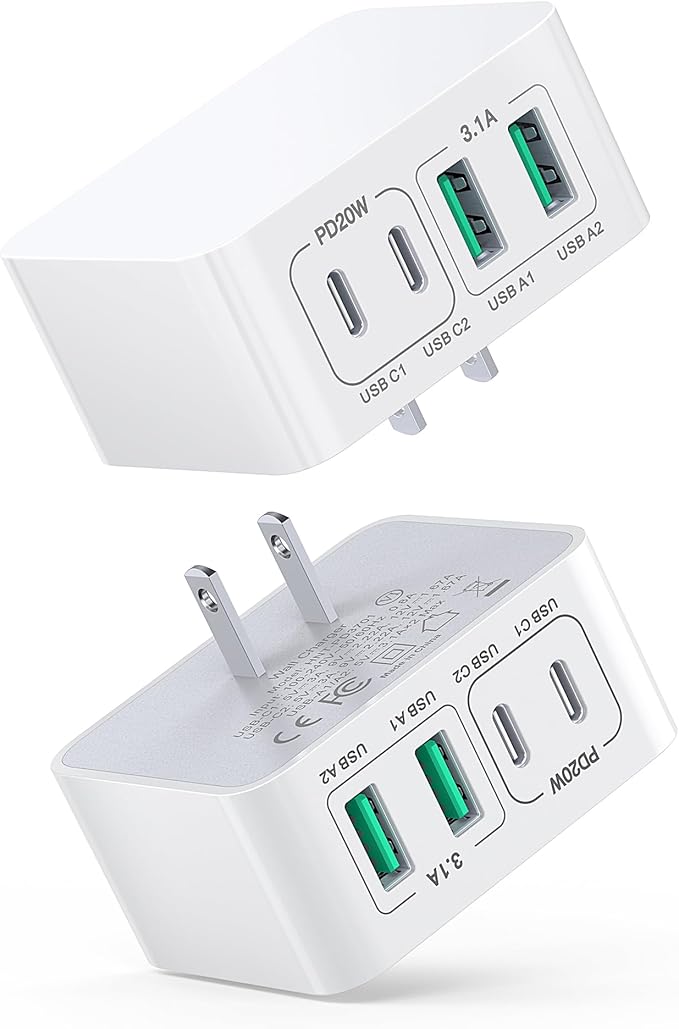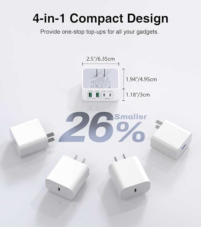 - Efficient 4-In-1 Wall Charger Block with Multiple Ports : Experience the convenience of our 4-port design, featuring two USB-C and two USB-A ports. Say goodbye to cluttered charging spaces as our dual usb c charger block enables simultaneous fast charging for up to four devices, all in one sleek and compact package