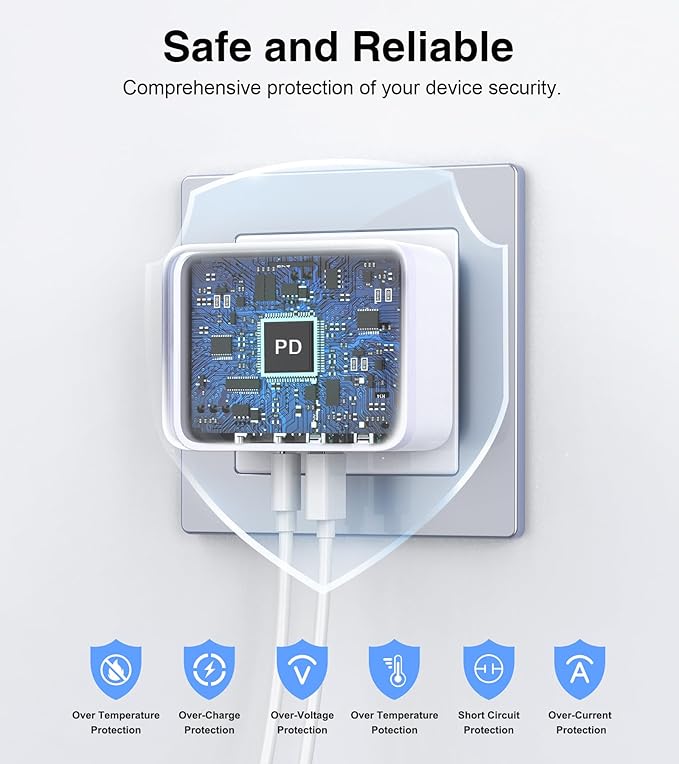 - Safe and Reliable Power Adapter : Experience peace of mind with our multiport usb wall plug, designed with a range of safety mechanisms such as Short Circuit Protection, Over Temperature Protection, Overvoltage Protection and Overcurrent Protection. Our phone charger is engineered for optimal performance, ensuring a secure and dependable fast charging experience. With CE, FCC, and RoHS certifications, this fast charger usb c guarantees safety and efficiency for quick device charging