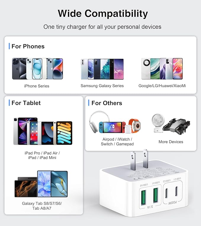 - Universal Compatibility Fast Charging Block : Our phone charger is compatible with iPhone 16/16 Pro/16 Pro Max/16 Plus/15/15 Plus/15 Pro/15 Pro Max/iPhone 14/14 Plus/14 Pro/14 Pro Max/13/13 Mini/13 Pro/13 Pro Max/12/12 Mini/12 Pro/12 Pro Max/11/11 Pro/11 Pro Max/XS Max/XS/XR/X/8/8 Plus/7/7 Plus/6/6S/SE/, iPad Pro/Air/Mini, AirPods Pro/AirPods4, Apple Watch series, Samsung Galaxy S24/S23/S22/S21/S21+/S21 Ultra/S20/S20 Ultra/S20 FE, Note 10, Note 20/20 Ultra/S10/Ultra2, Galaxy Z Fold 3, A53, A71, Tab S7/S7+/S8/S8+, LG, Google Pixel, and more