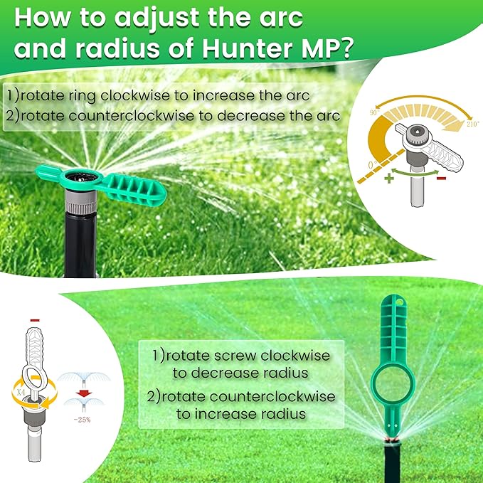 - 【Practical Rotator Adjustment Tool】compatible with Hunter MP Rotator Nozzles MP100090, MP1000210, MP1000360, MP200090, MP2000210, MP2000360, MP300090, MP3000210, MP3000360, MP300090, MP80090, and MP80036; Rotate the arc adjustment ring clockwise to increase the arc or counterclockwise to decrease the arc; Turn the radius adjustment screw clockwise to decrease the radius or counterclockwise to increase the radius
