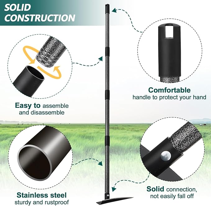 • Adjustable Handle Length: The weeding hoe's handle can adjust to 60" to accommodate gardeners of different heights. The ergonomic long handle can help protect your back and waist by reducing the need to bend. Length adjustment is quick and easy, just add or remove extension rods!