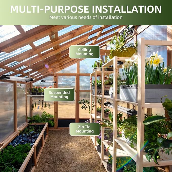 - [Easy Installation & Safe]: These grow lights can be installed in a variety of ways to meet the needs of various installation environments. Equipped with screws, hooks,chains, zip ties and brackets.