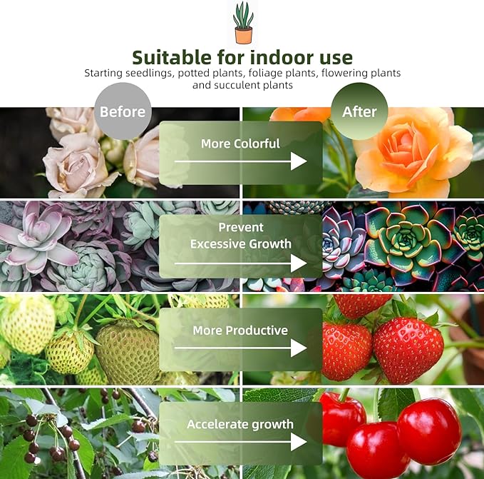- [Widely Application]: Suitable for use in shelves-plants, greenhouse, potted, catcus, kitchen, bathroom, grow box, darkroom. Especially in places with insufficient sunshine in winter.The grow light fixture with high PPFD can be used for seed starting, flowering and fruiting.