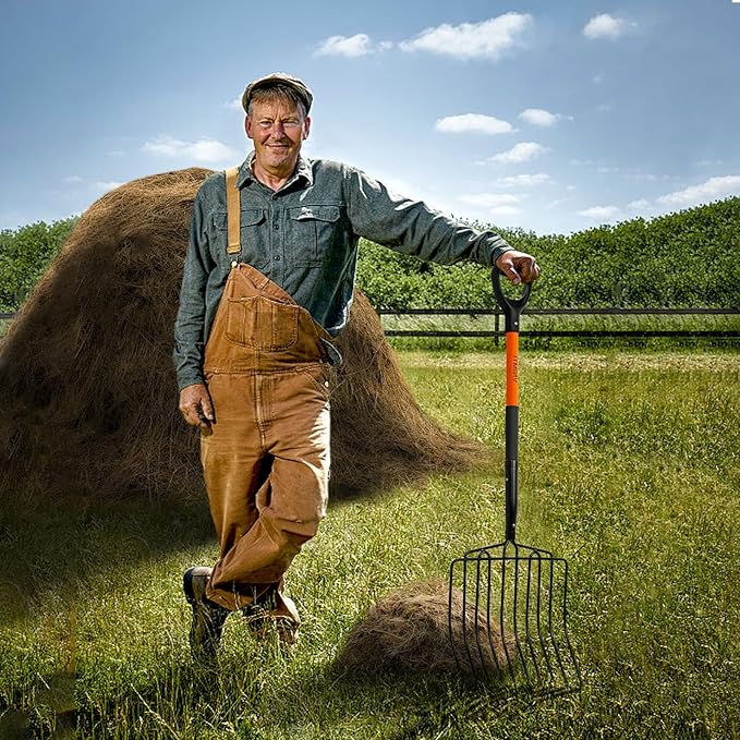 - Reliable Structure: High-carbon steel wide pitch fork head and thickened fiberglass handle are double-reinforced with 2 rivets to ensure a stable and reliable structure that won't loosen or fall off during multiple uses or high-intensity work, this is a durable and trustworthy pitchfork that provides long-lasting support for your gardening!