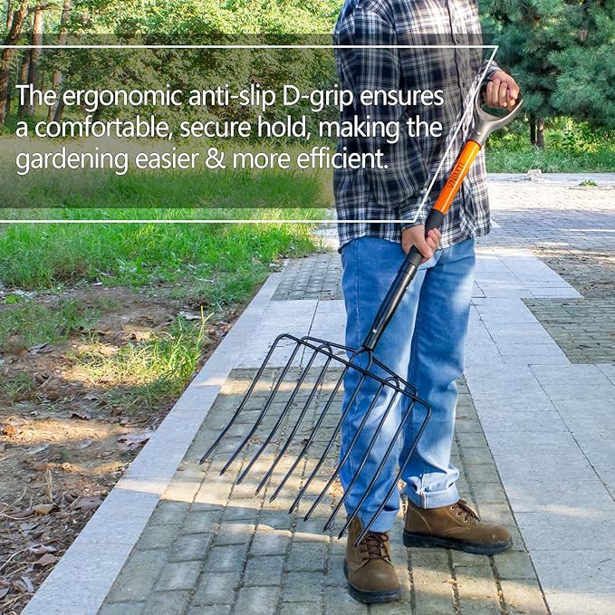 - Ergonomic D-Grip: The ensilage fork come with a D-grip and a high quality non-slip sleeve in the middle of the handle, which perfectly combines with the ergonomic design to provide a firm grip, and the non-slip grip ensures a stable hold in dry or wet environments, making it more comfortable and efficient when using the garden fork!