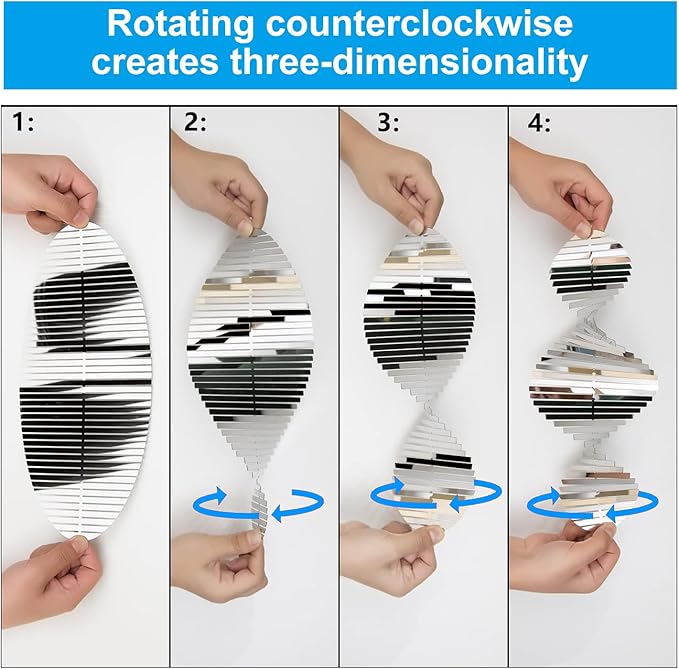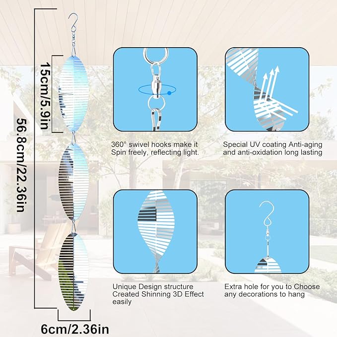 - 3D Shape, Easy Installation: These Wind Spinners are equipped with an S hook and a crystal pendant. You just need to gently rotate the Wind Spinner to your preferred angle and they can present a perfect 3D effect anywhere. They are extremely beautiful when shined under sunlight or rotating in a breeze. These are 3 strings with 4 wind spinners of very reflective can rotate easily in the breeze, Reflects bright light to scare away birds.