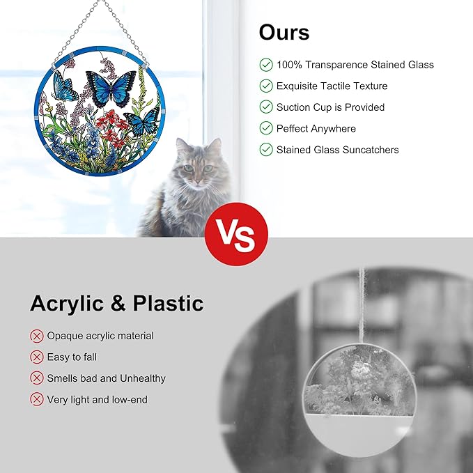 - 【Design Feature】This colored stained glass suncatcher is inspired by the beauty of nature, with an exquisite depiction of fluttering butterflies and blooming flowers in a vibrant palette. Butterflies symbolize transformation and rebirth, while flowers represent beauty and the flourishing of life, creating a harmonious and energetic addition to your space.