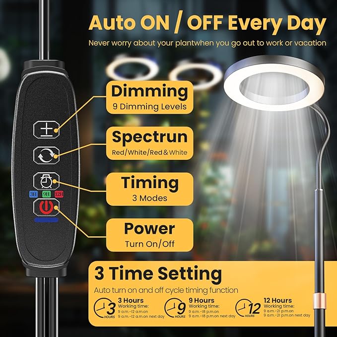 - Three cycle timing settings, this plant light will automatically turn on/off according to your desired schedule every day: 3/9/12H.