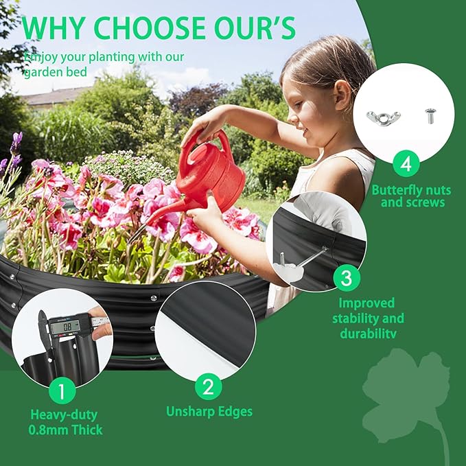 - 【EASY ASSEMBLY】: This galvanized steel raised garden bed only takes about 15 minutes to assemble easily,a screwdriver and a pair of gloves are need,which are prepared in the package already