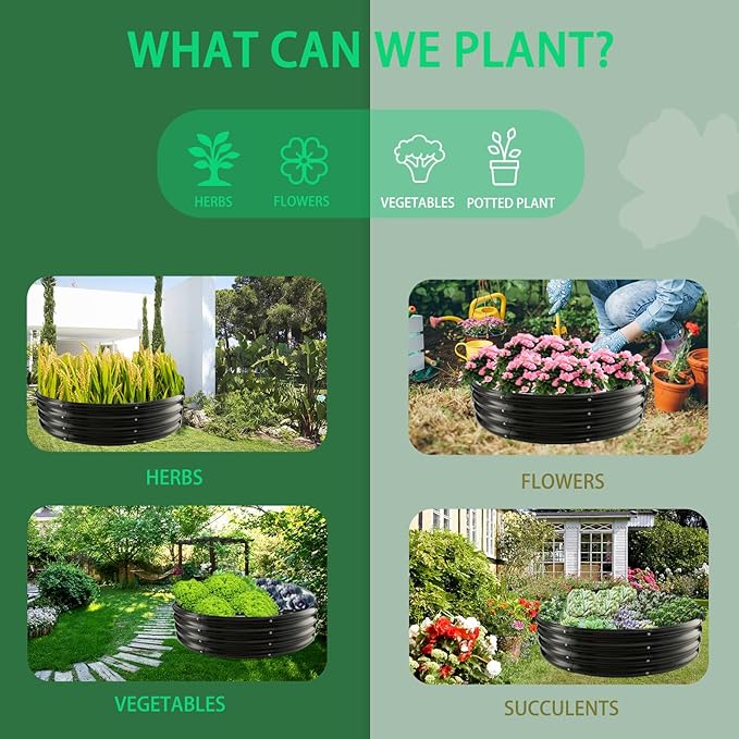 - 【STABLE】: This round raised garden bed is 60 IN Diameter,11.8 IN Tall, each is made of 0.8 MM thick Q195 galvanized metal sheet, double-layer anti-corrosion galvanizing and round structure design,it will provide a solid foundation for your plants