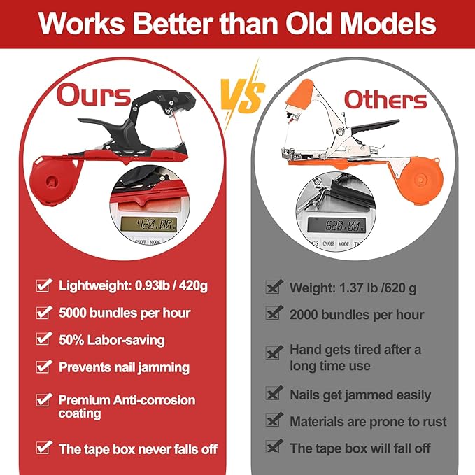 - Wider Jaw and Lightweight: This professional garden tape tool features a larger 50mm opening jaw. So It can also be widely used on thicker branches. Lighter than old model plant taping machines (Only 0.92lb). It works more efficiently and can save 50% of labor time.