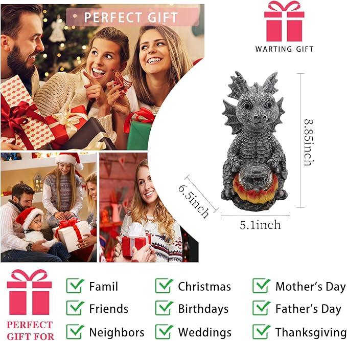 - 【Unique Dragon Design】This cute Grey Dragon outdoor decor With 7-Color Changing Solar Crackle Globe Lights, 7-color light cycle change,adds a touch of magic to your outdoor space. Dragon statue 6.5"x 5.1"x8.85" size ensures it becomes a focal point in your garden, pathway, or even on a wide windowsill, leaving a lasting impression.