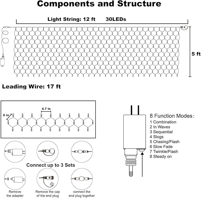 - Christmas Net Mesh Lights: Cool white net decorative lights, come with super bright 360 LEDs and UL Certified adapter. Low voltage plug, safety voltage for human body. Enjoy the twinkling net lights pleasantly. Mesh panel size 12ft x 5ft with 17ft lead cable. Can be extended to a maximum of 3 light chains (maximum 1000 LED), to decorate your lighting area with the desired length