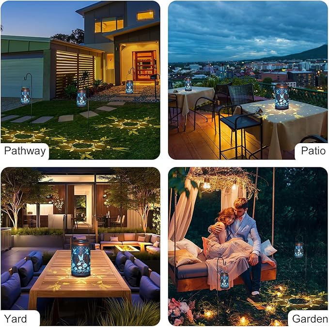 - 【Gorgeous Design】-- The outdoor solar lanterns combine vintage Blue and hummingbird patterns. The decorative lantern emits soft golden light at night and displays dynamic and beautiful patterns on the