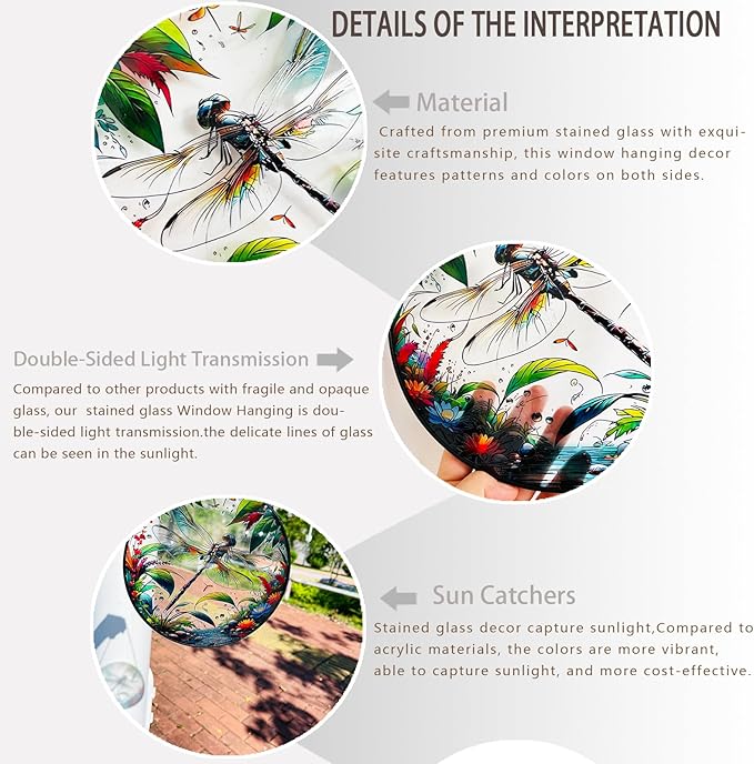 - Stained Glass Window Hanging Captivating Beauty: Our stained glass window hanging dragonfly showcases a mesmerizing blend of sun-through, casting enchanting shadows and creating a stunning kaleidoscope of colors on your window or wall. It serves as a perfect sun catchers indoor window decor, transforming your space into a vibrant and artistic sanctuary