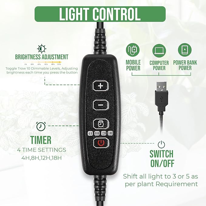 - 🌻ADVANCE PLANT ILLUMINATOR WITH SMART TIMER: This LED grow light offers a comprehensive spectrum to natural sunlight. It allows setting lighting durations of 4/8/12/18 hrs to simulate a natural growth. After setting the timer, the light will automatically turn on/off.